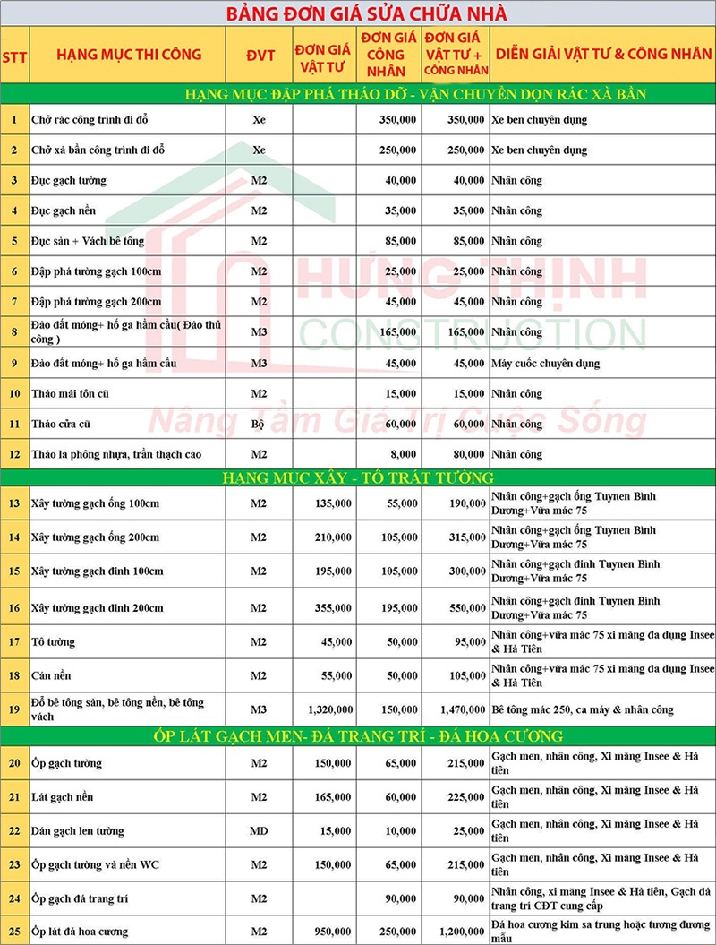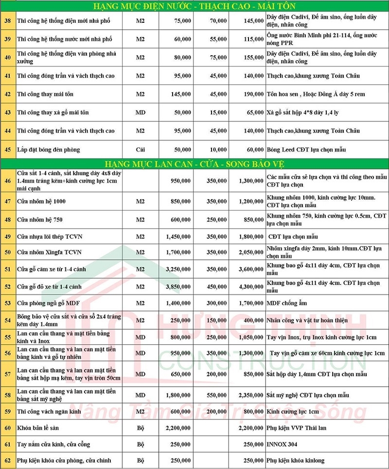 Đơn giá trên áp dụng cho công trình sửa nhà nâng tầng trọn gói. Đơn giá sẽ còn phụ thuộc vào nhiều vào yếu tố khách quan như diện tích xây dựng, điều kiện thi công, chủng loại vật liệu hoàn thiện…. Để nắm bắt chính xác về đơn giá sửa nhà nâng tầng trọn gói, hãy liên hệ với chúng tôi: 0962068792, chúng tôi sẽ tới khảo sát tư vấn và làm bảng dự toán mà hoàn toàn không mất phí.
